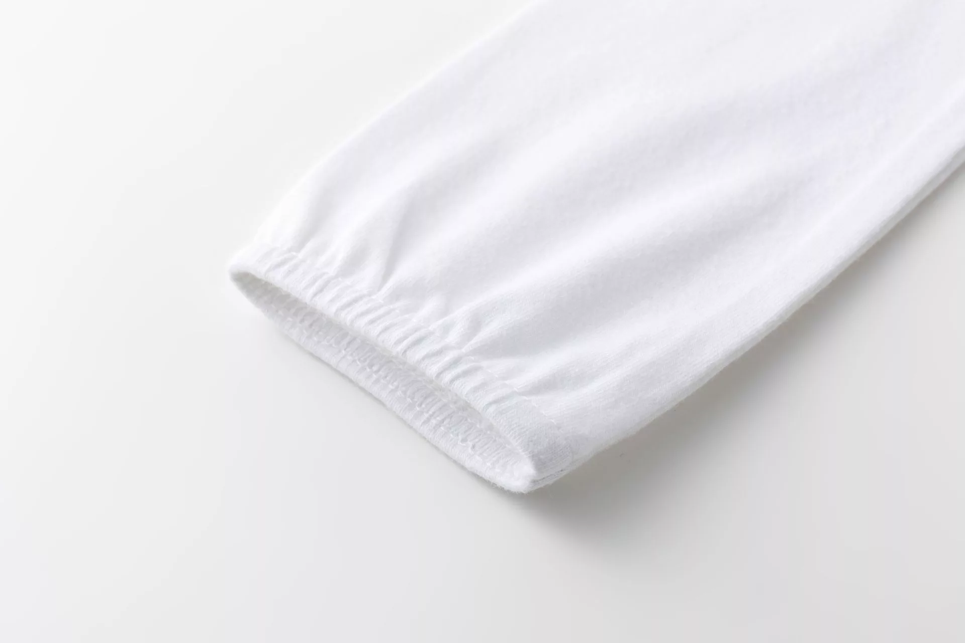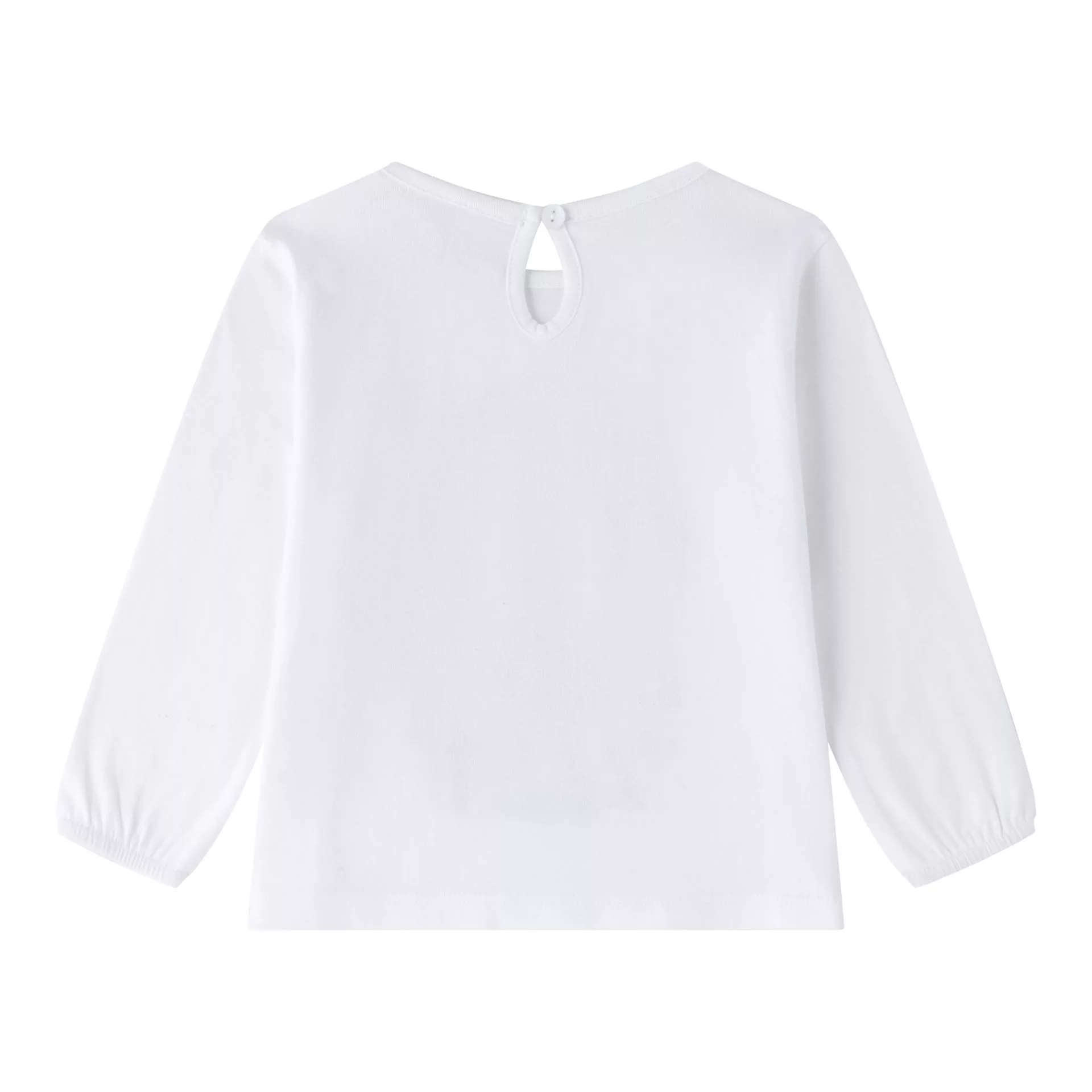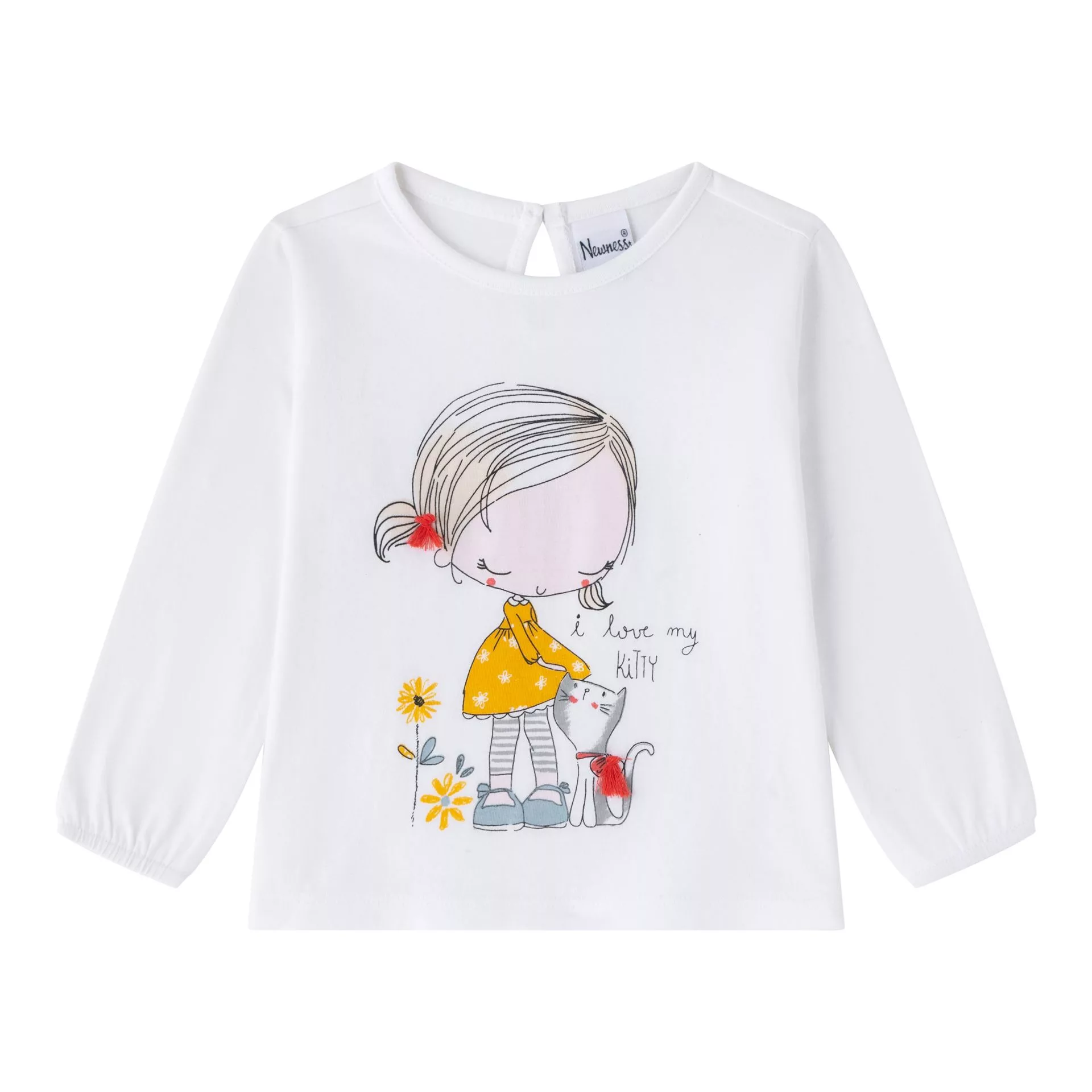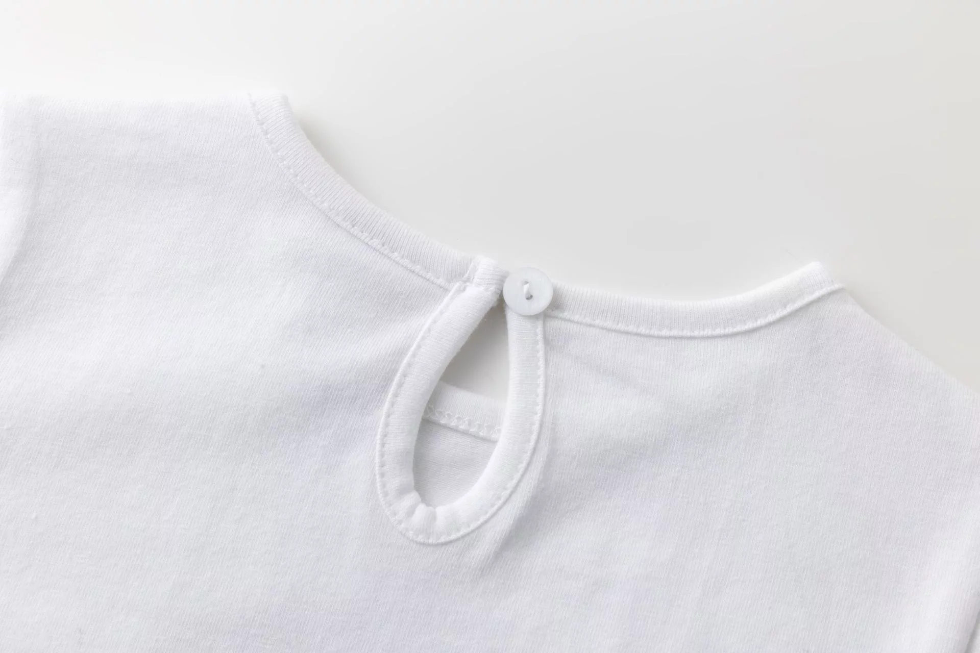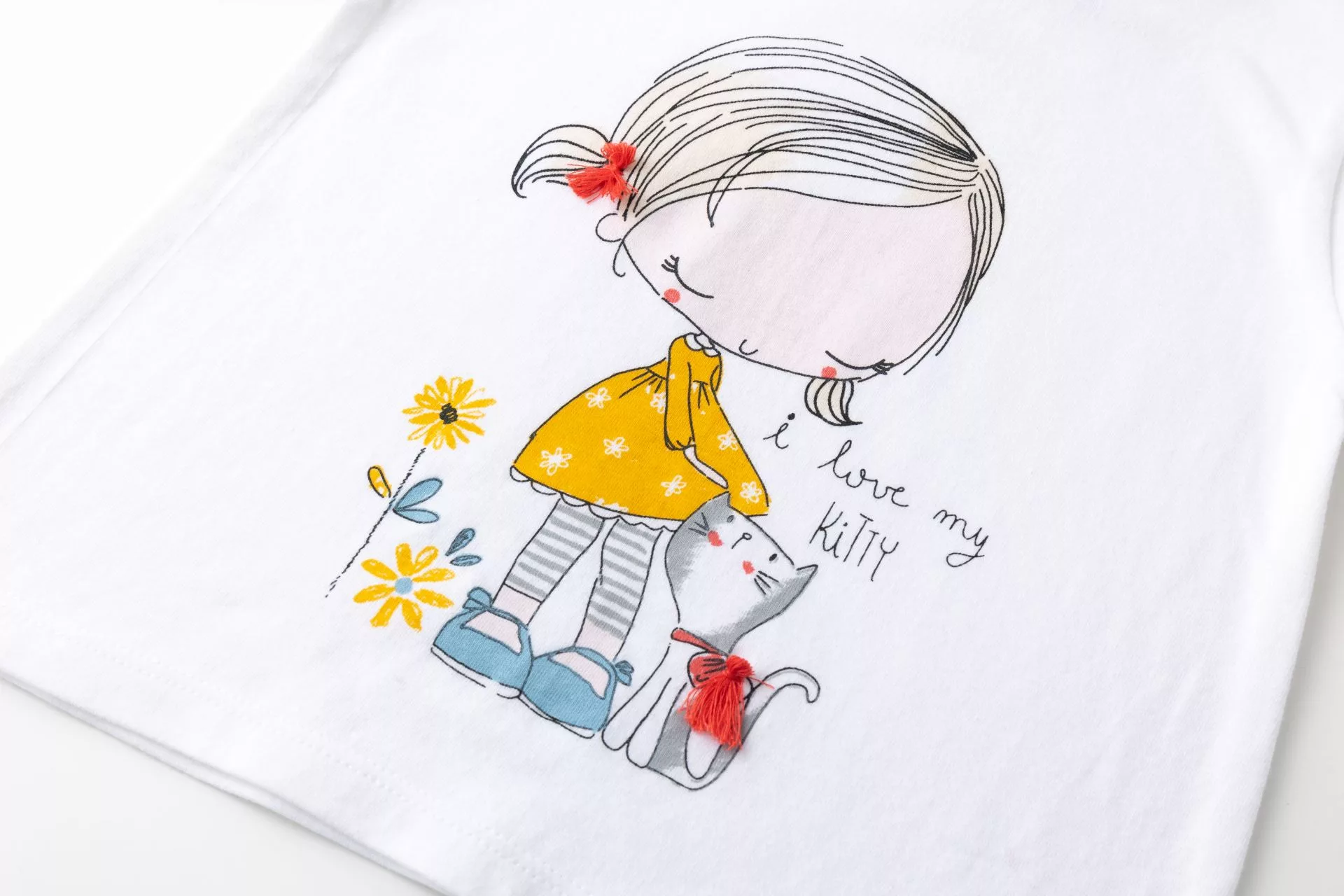 Camiseta en single jersey elástico, con estampado al agua y detalle de flecos en delantero. Abertura con botón de plástico en espalda