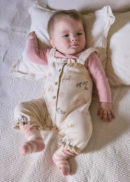 Diseño con tirantes. Botones a presión en la entrepierna para facilitar la puesta de la prenda. Cierre con botones. Modelo con rizo. Bajo elástico para un mejor ajuste. Diseño estampado.