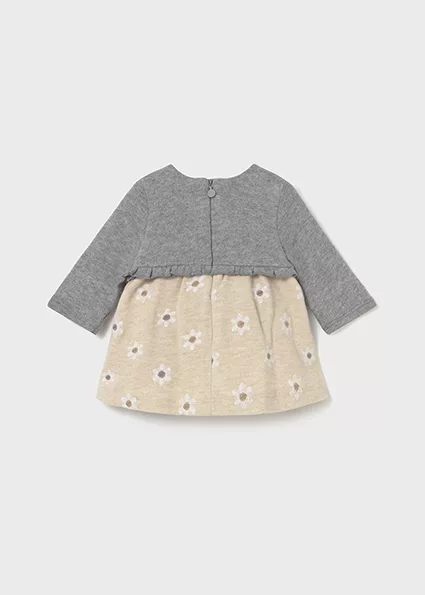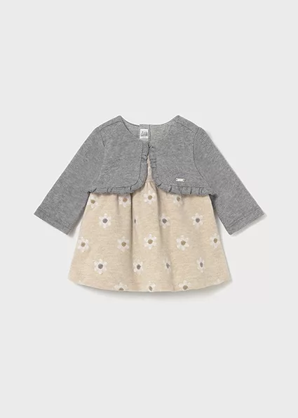 Vestido de manga larga para recién nacida. Cuello redondo. Diseño con rebeca simulada en superposición. Cierre con cremallera en la parte trasera para una puesta ágil y rápida. Confección combinada en distintos tejidos para conseguir un diseño único y especial. Modelo con rizo. Diseño estampado.