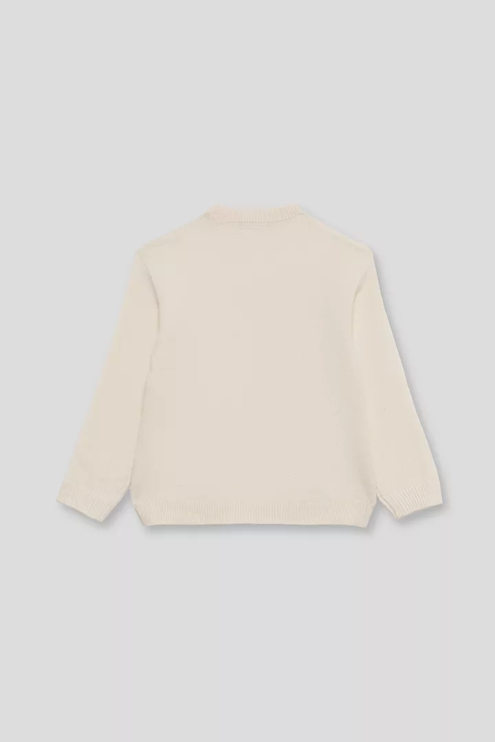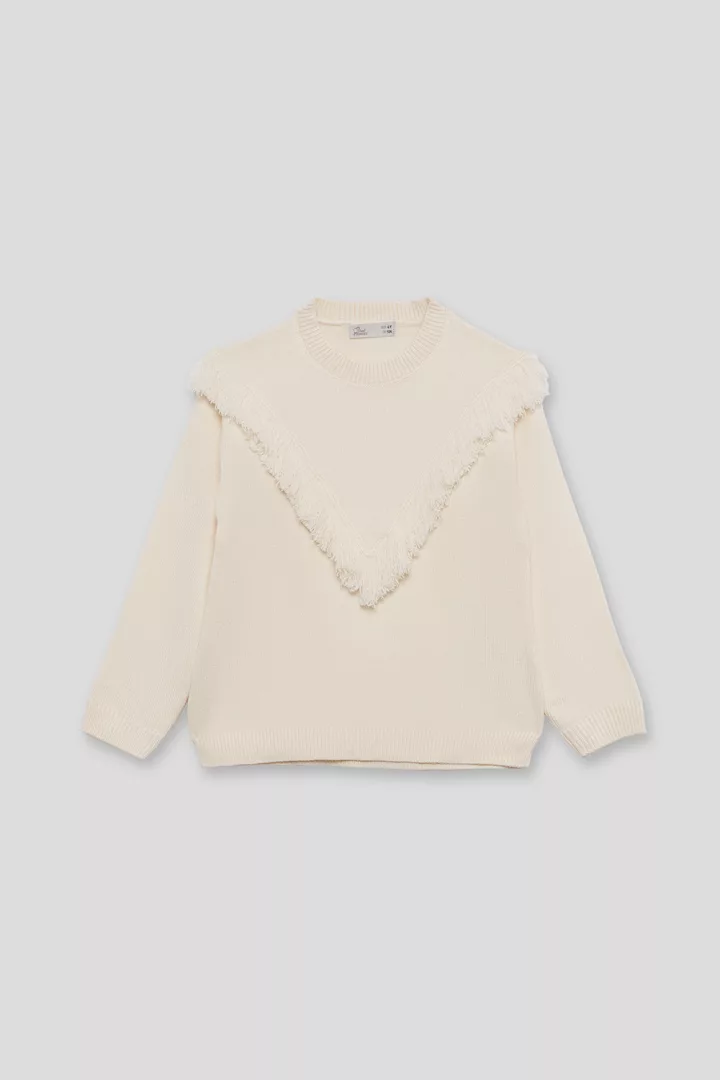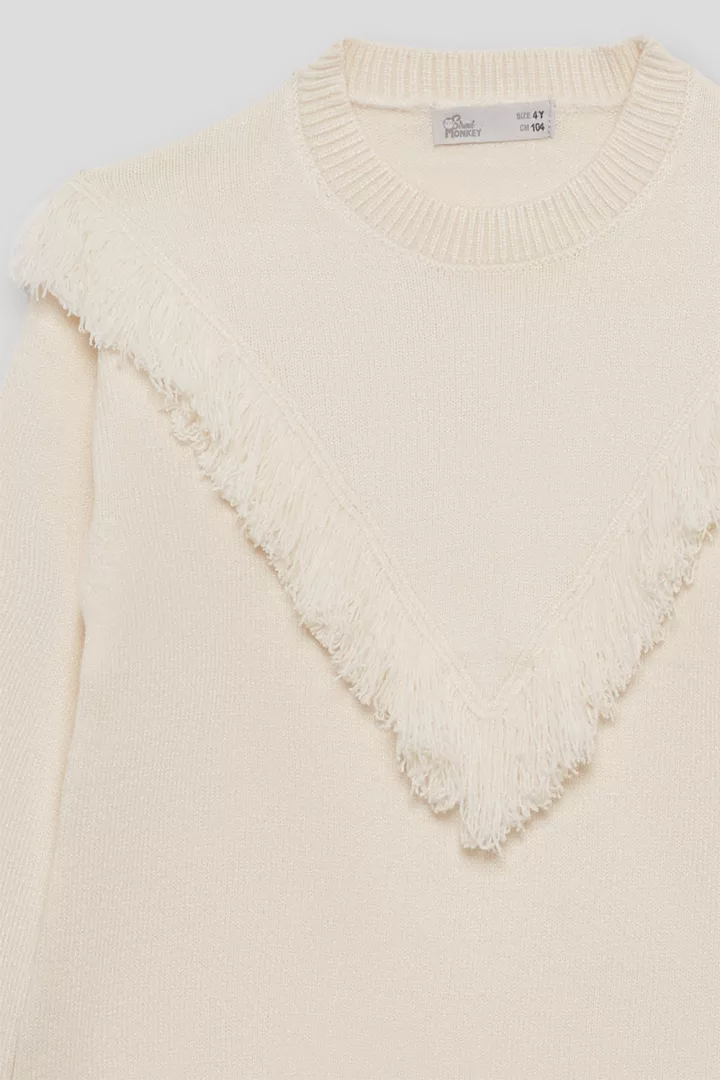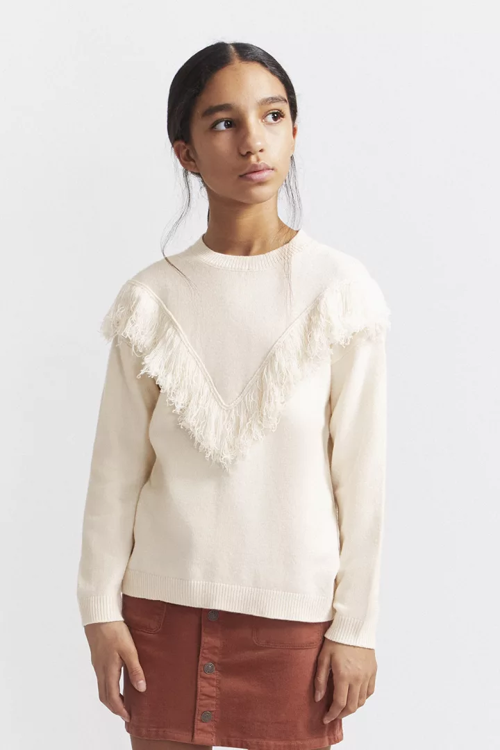 Jersey de punto en color beige, con cuello redondo y acabados de canalé en puños y bajo. El diseño presenta un detalle decorativo de flecos en forma de “V” en la parte delantera, aportando un toque bohemio y actual. Espalda lisa.