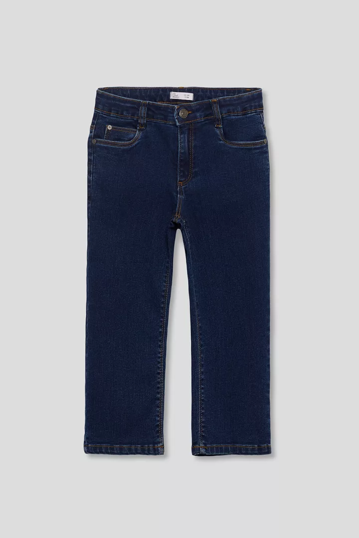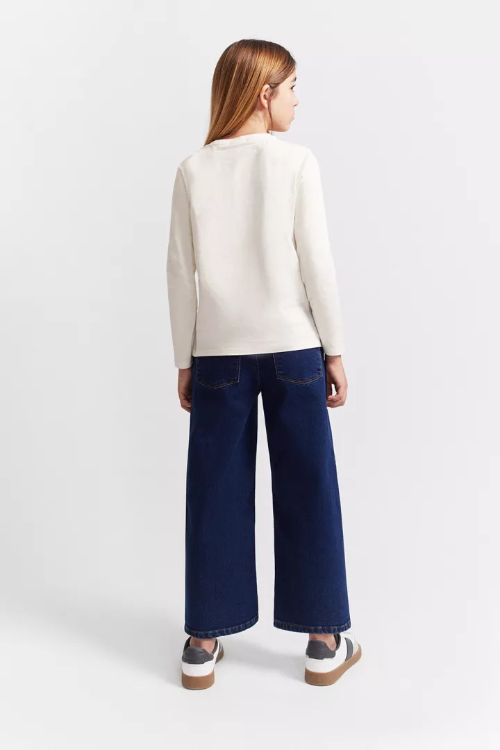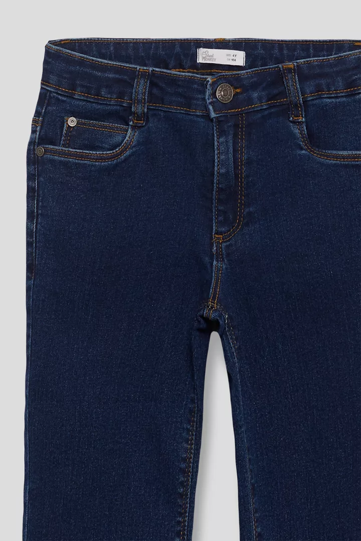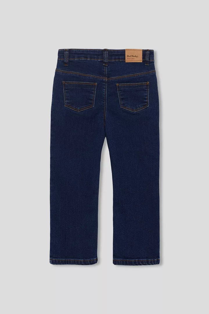 Modelo confeccionado en tejido denim elástico con efecto lavado, denim oscuro. Presenta cintura alta con goma ancha de canalé, que aporta comodidad y sujeción sin apretar. Incluye bolsillos delanteros y traseros funcionales, con costuras en contraste que realzan el diseño.