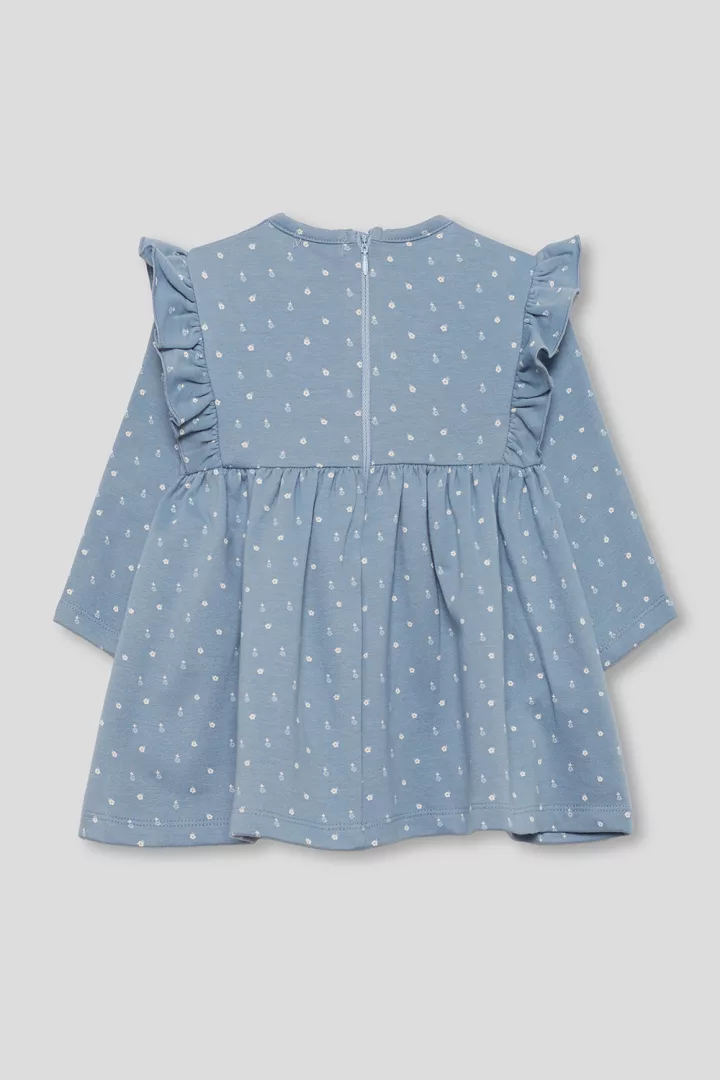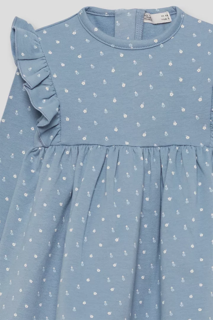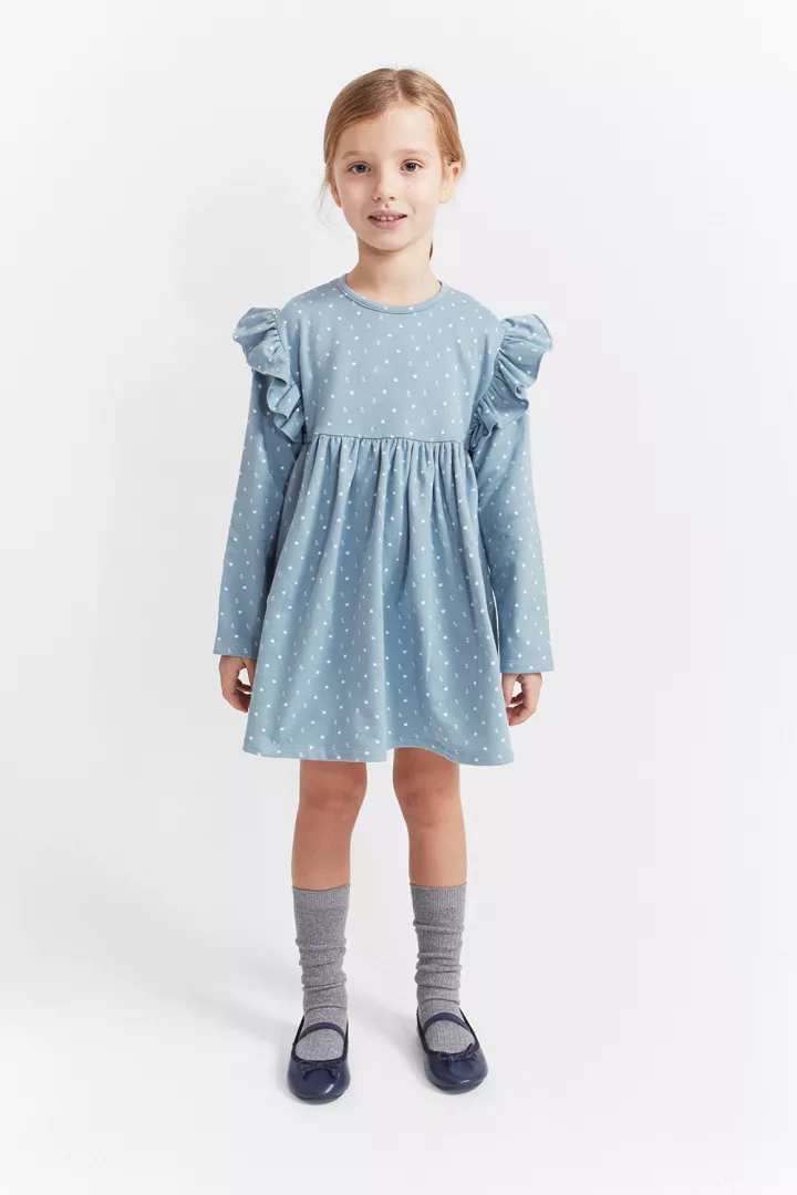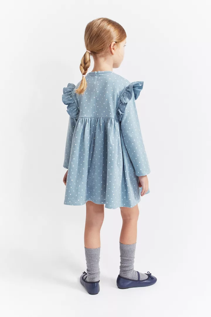 Vestido en color azulina con un delicado estampado de pequeños corazones blancos, ideal para los días frescos. Presenta un bonito diseño con volantes en los hombros que aportan volumen y un toque femenino. El corte bajo el pecho da paso a una falda con mucho movimiento, perfecta para sus juegos y aventuras. El vestido incluye cuello redondo y cierre de botones en la espalda en las tallas de meses, facilitando la puesta diaria.