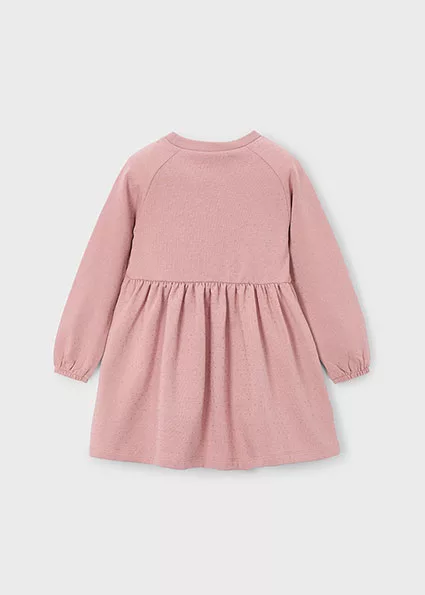Vestido de manga ranglán para niña. Modelo con cuello barco. Cálido tejido de felpa gruesa (felpa perchada), perfecta para los meses fríos. Modelo con rizo.