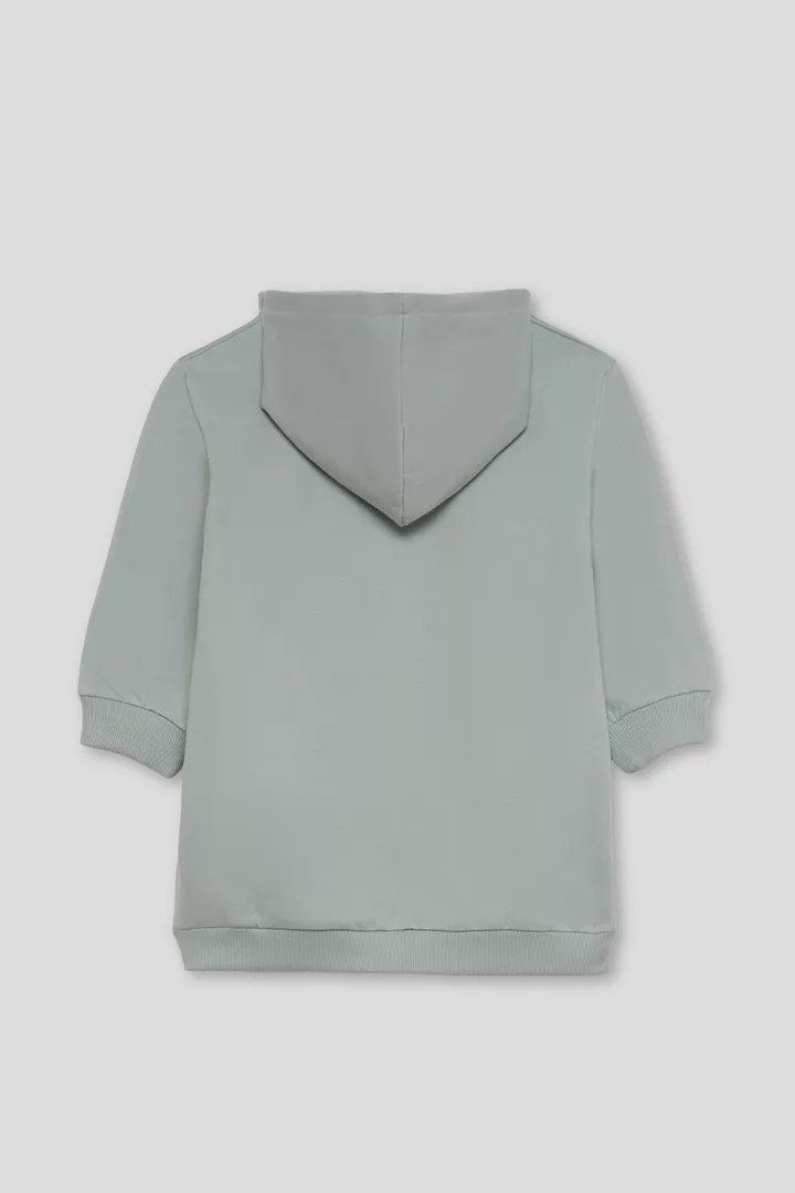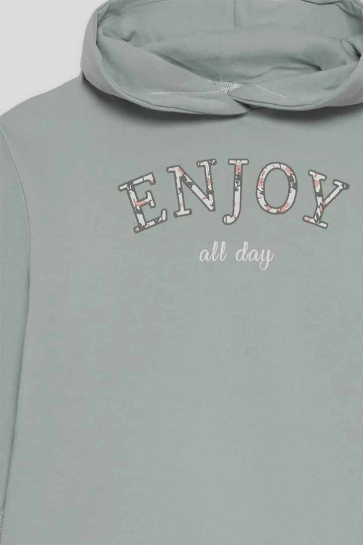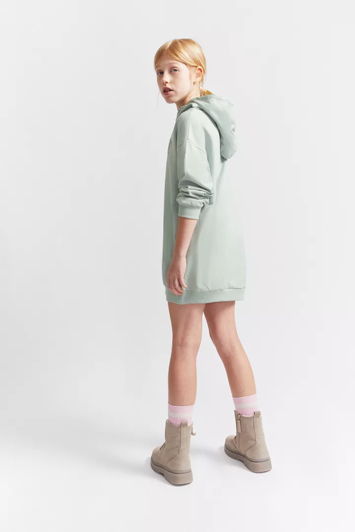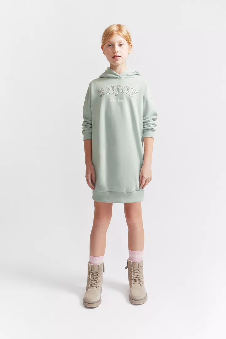 Vestido tipo sudadera en color verde iceberg con capucha y manga larga. Presenta diseño relajado con hombros caídos, puños y bajo en canalé. El detalle frontal con texto “ENJOY all day” combina bordado y estampado con acabado de purpurina, aportando un toque divertido y actual.