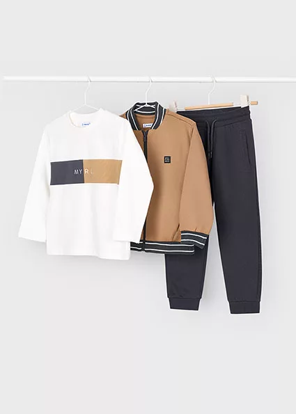 Chándal de tres piezas para niño compuesto por una sudadera, un pantalón largo deportivo y una camiseta a juego.