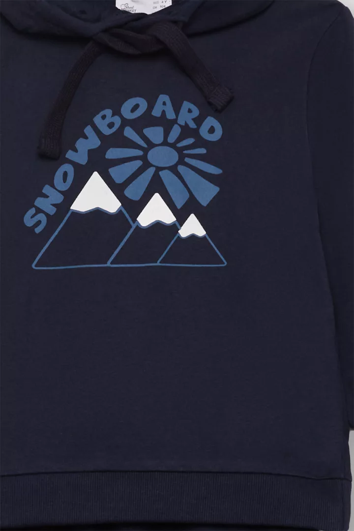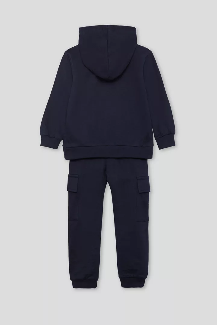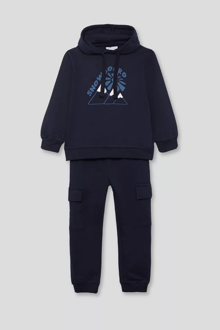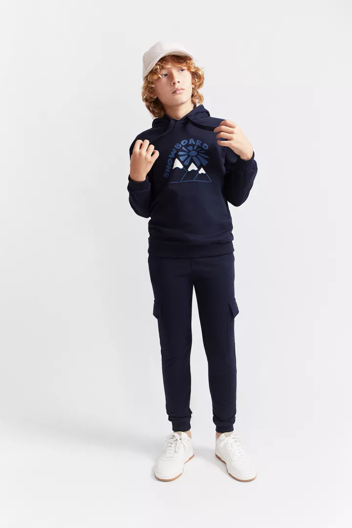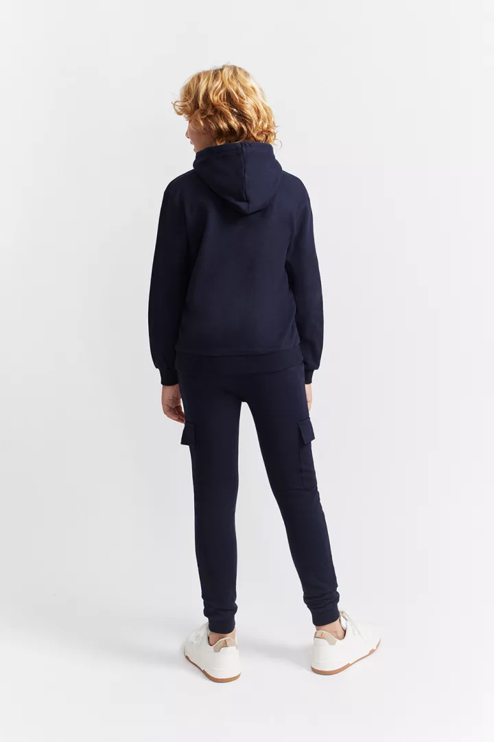 Conjunto en color azul noche, con sudadera de manga larga, capucha y bajo en canalé. Pantalón tipo jogger con bolsillos laterales tipo cargo con solapa y cintura elástica con cordón ajustable. Interior afelpado, ideal para abrigar con estilo. Un look cómodo y urbano para el día a día.