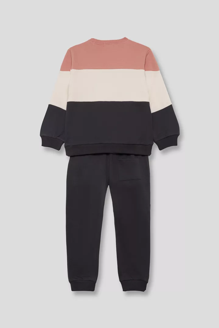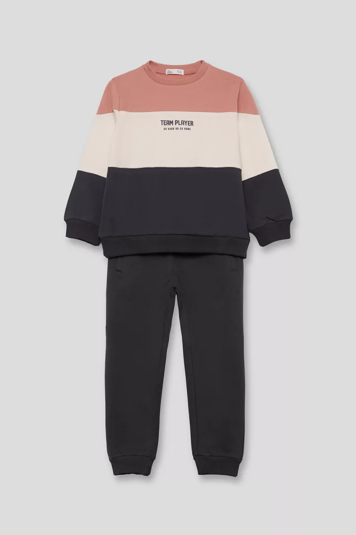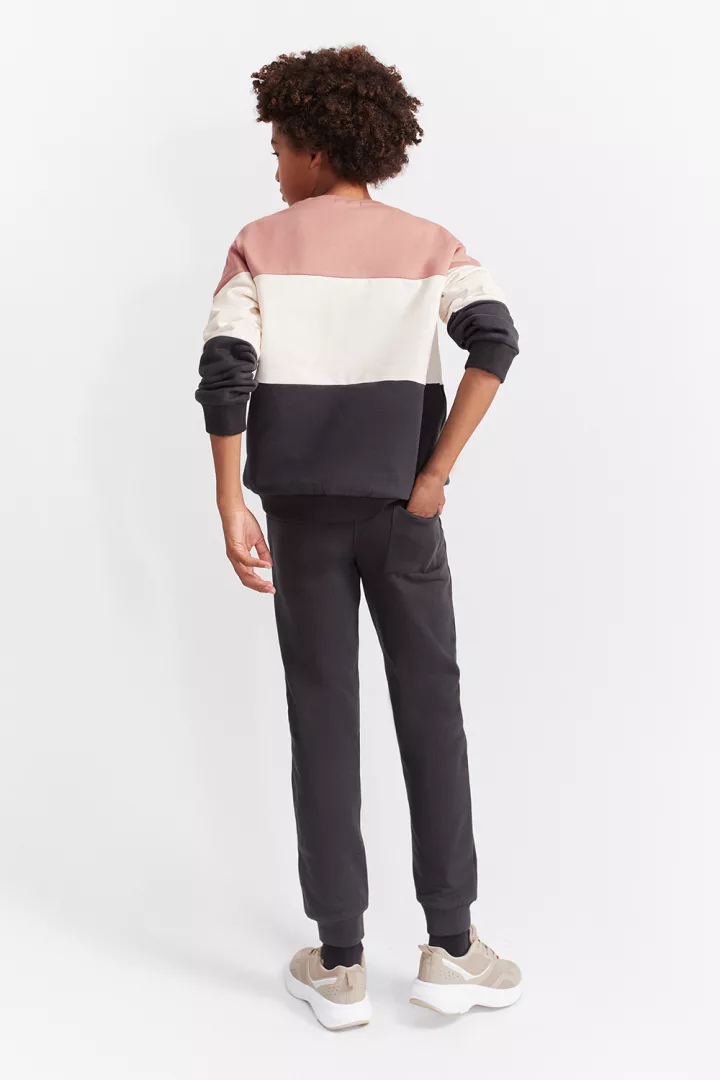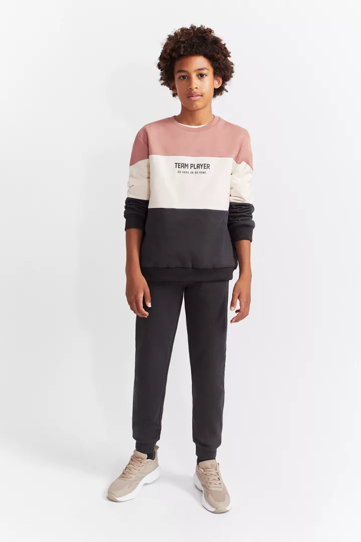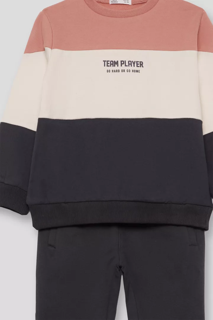 Sudadera de manga larga confeccionada en tres bloques de color: rosa empolvado en la parte superior, crudo en el centro y gris oscuro en la parte inferior. Lleva el texto “Team Player – Go Hard or Go Home” en el pecho y acabados de canalé en puños y bajo. El pantalón jogger a juego, en gris oscuro, presenta cintura elástica con ajuste interior y bajos acabados en puño para mayor comodidad.