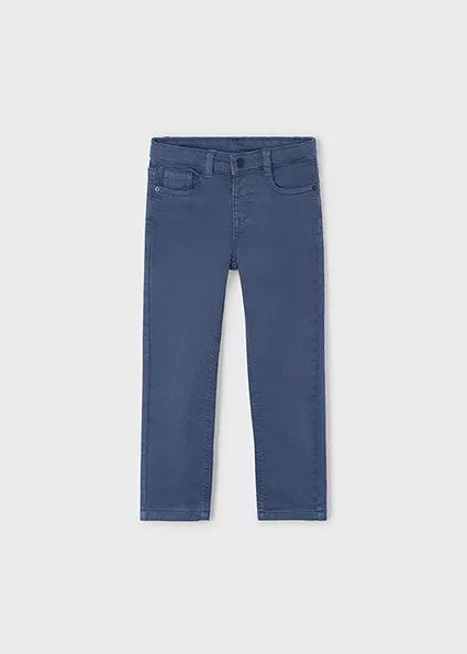 Pantalón largo de línea clásica y corte recto (Regular fit) para niño. Cierre con cremallera y botón. Goma elástica regulable con botones en el interior de la cinturilla para mayor ajuste.
