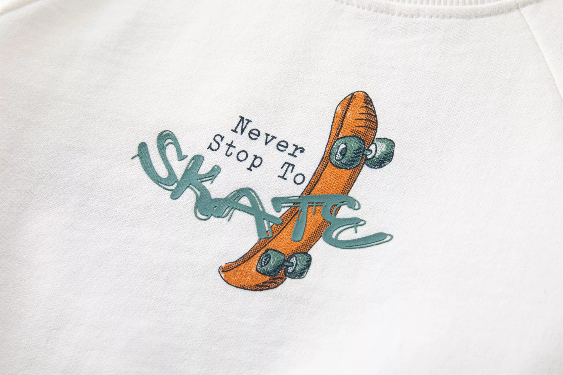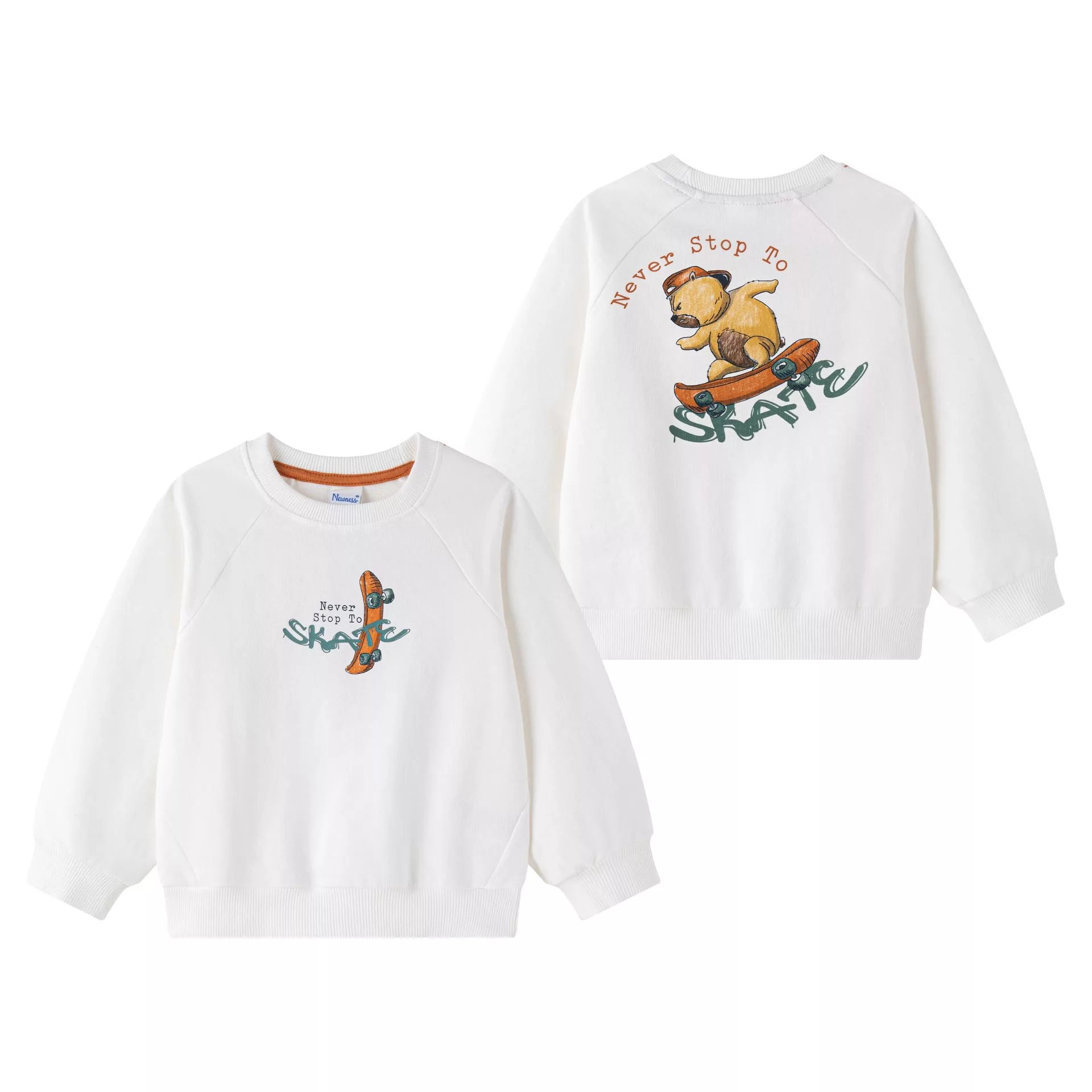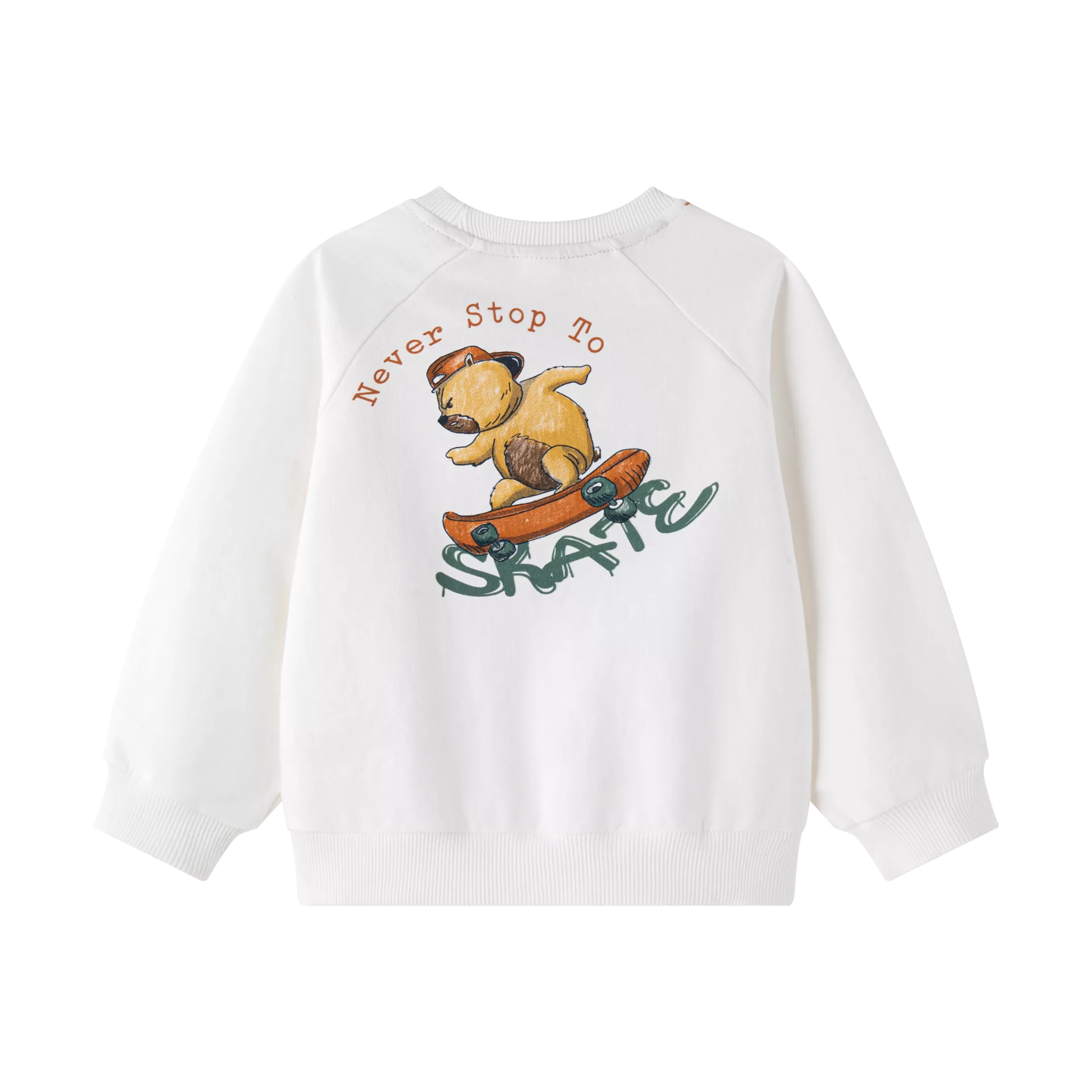 Sudadera de niño con manga larga caida con cortes laterales. Gráfico delantero y trasero osito en skate.