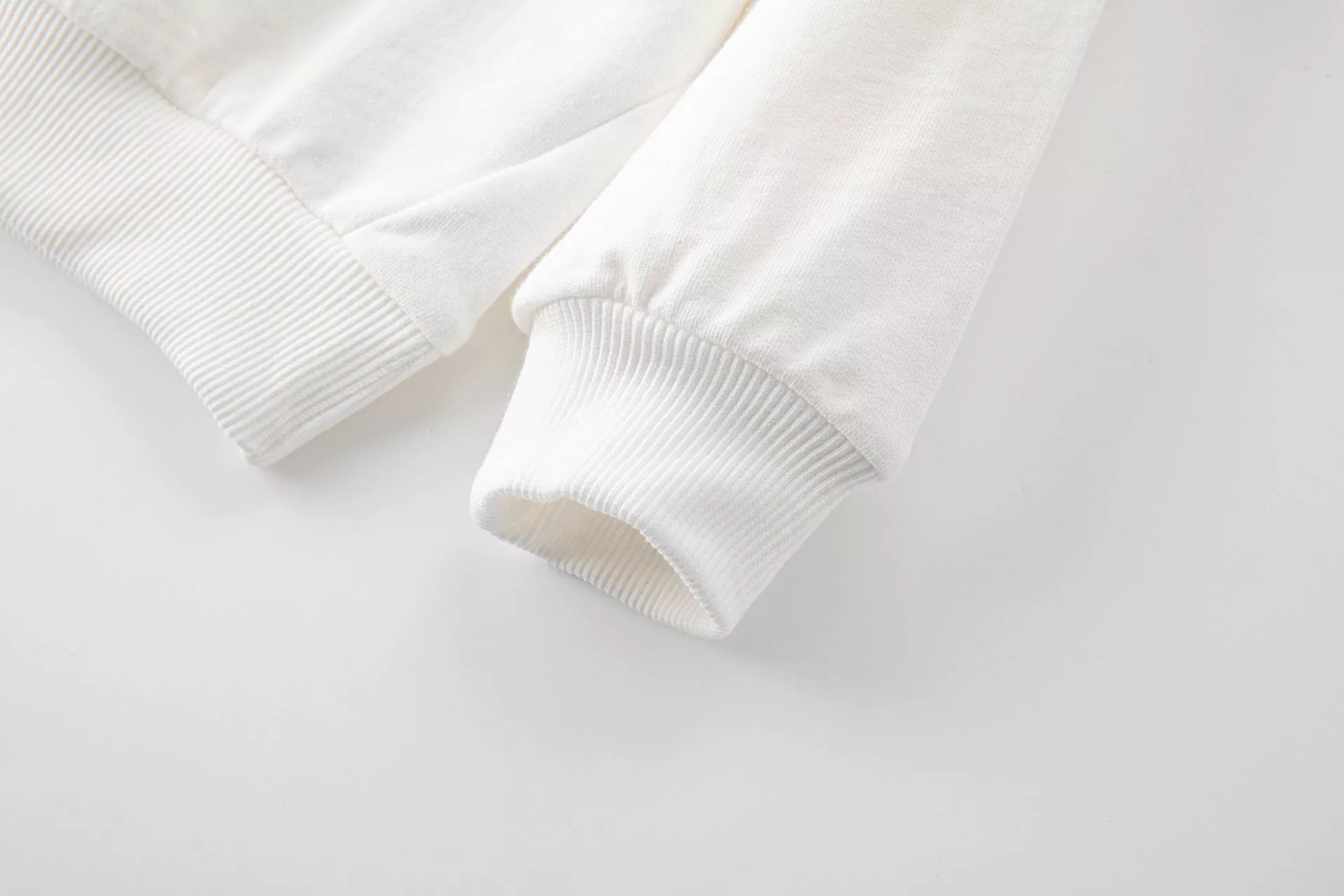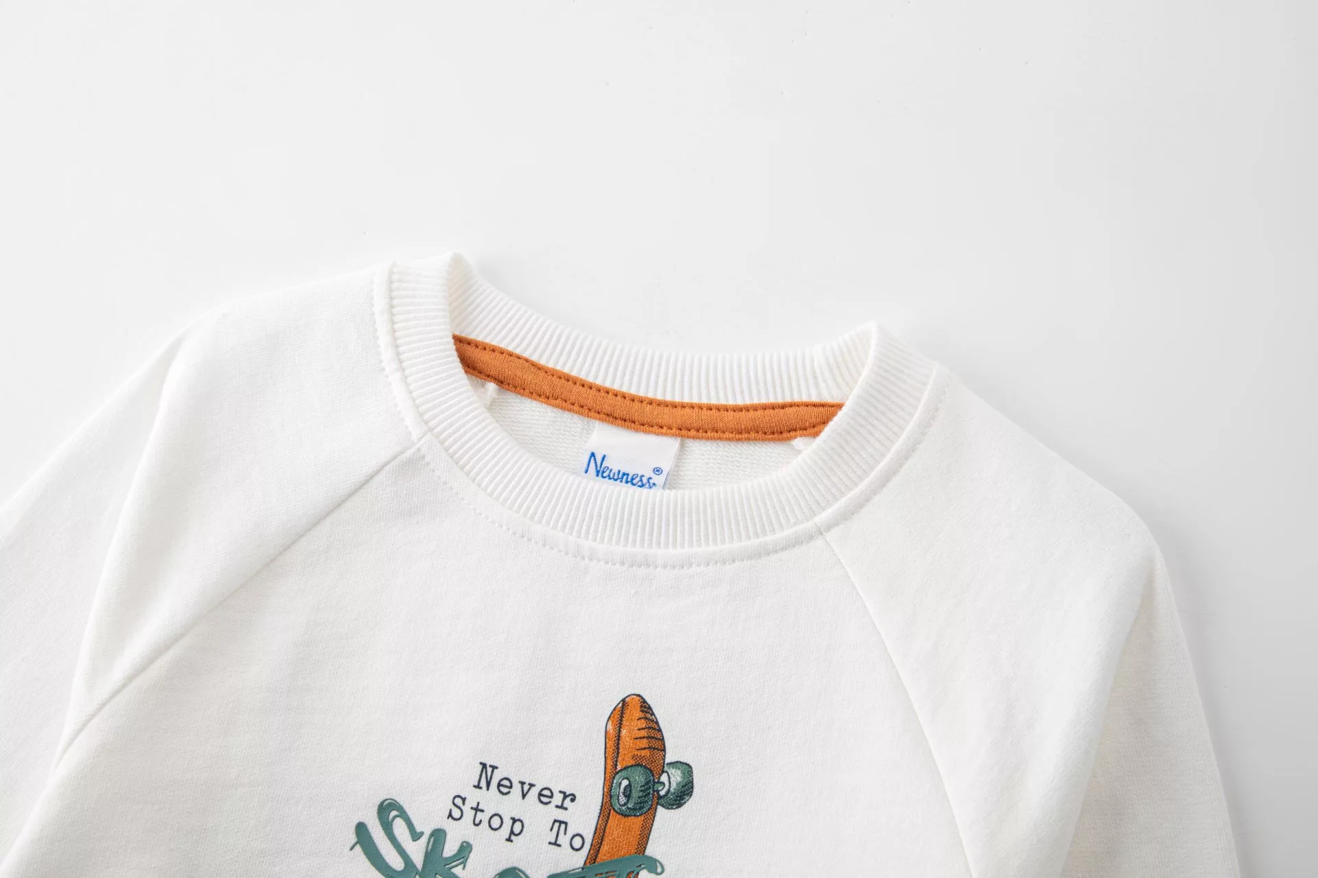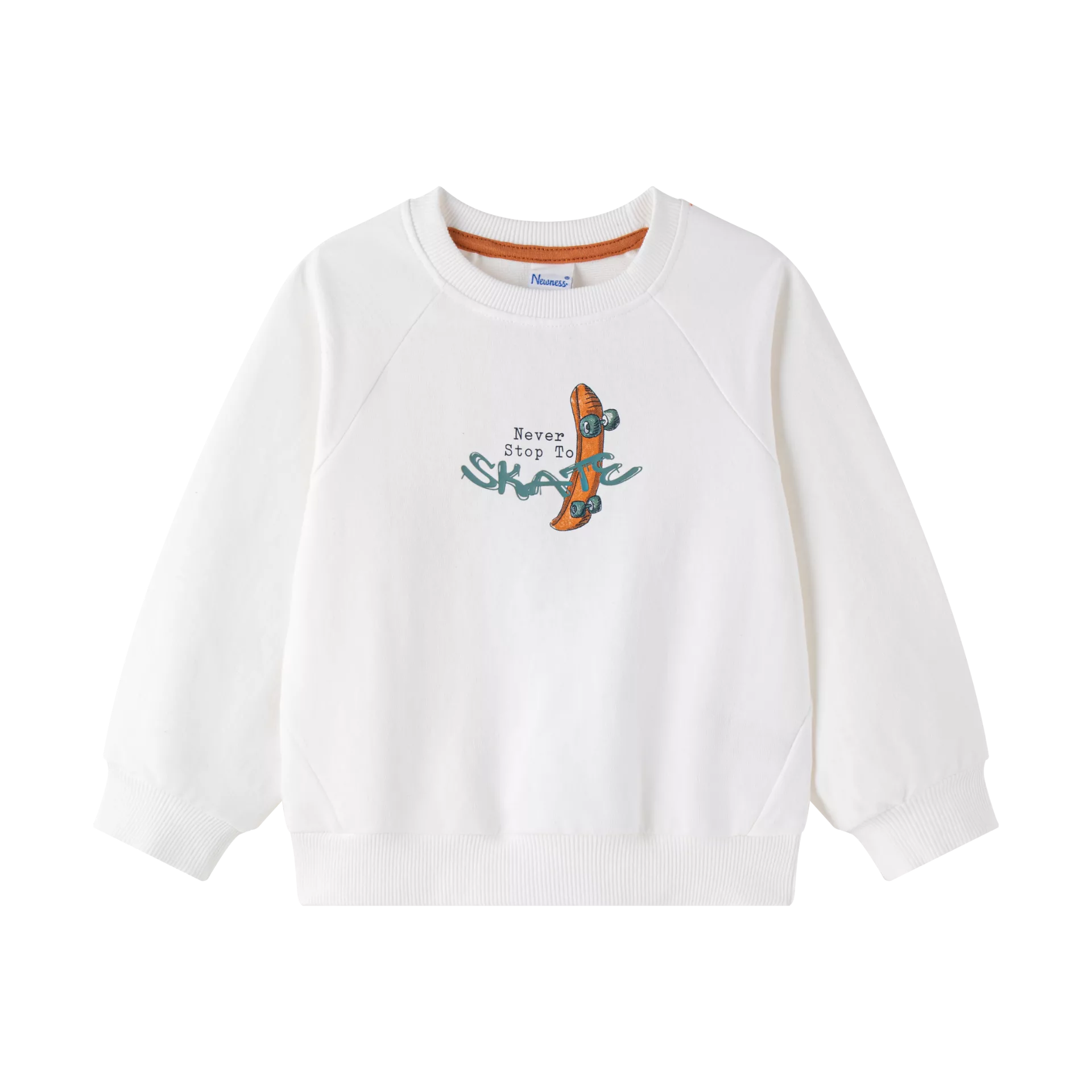 Sudadera de niño con manga larga caida con cortes laterales. Gráfico delantero y trasero osito en skate.