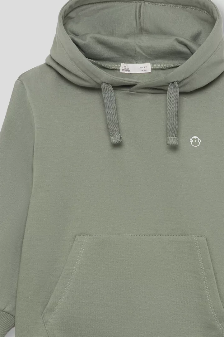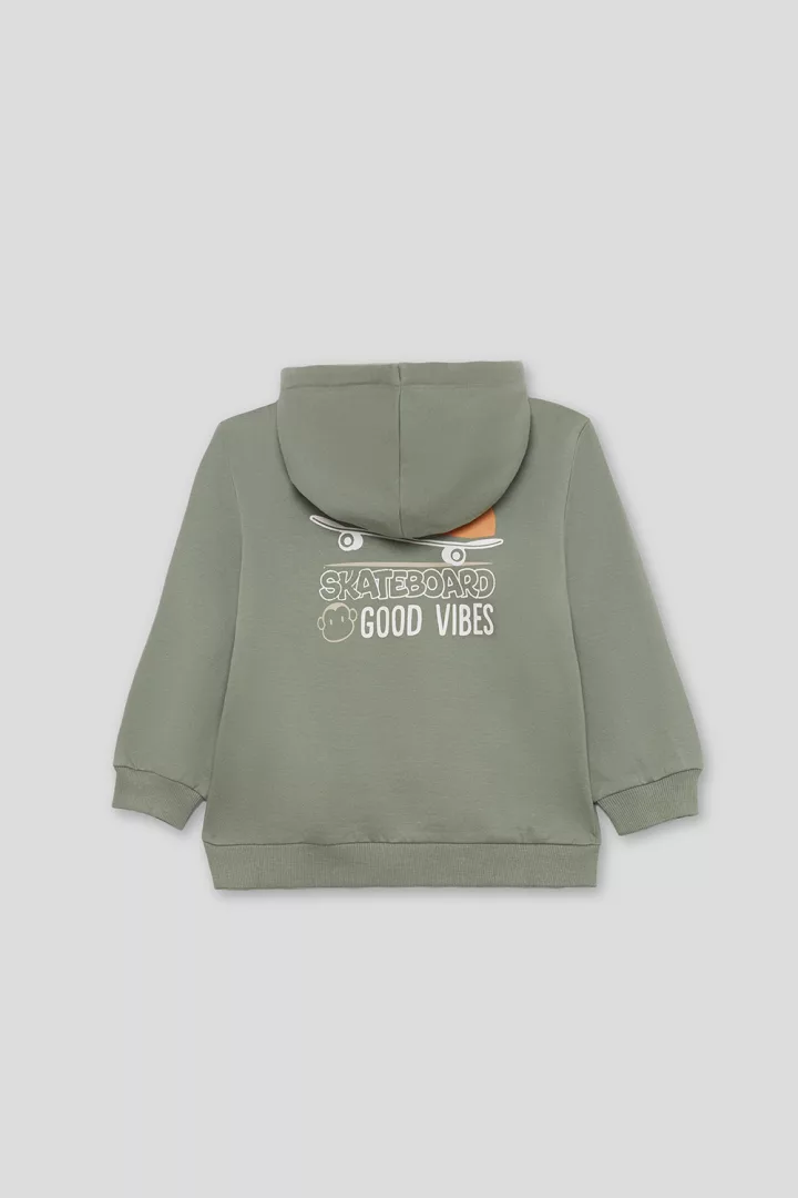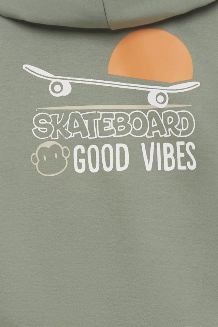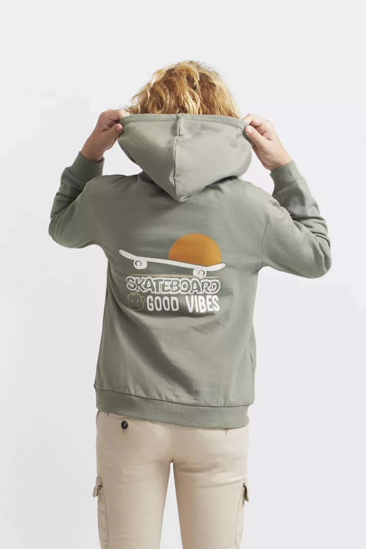 Sudadera de diseño cómodo de felpa suave, con bolsillo tipo canguro en la parte delantera, capucha con cordones decorativos y puños y bajo elásticos para un ajuste confortable. El detalle de una pequeña silueta de mono en el pecho añade un toque discreto al frontal, mientras que la parte trasera luce un estampado llamativo de monopatín con el mensaje “Skateboard Good Vibes” en tonos blanco, mostaza y tierra.